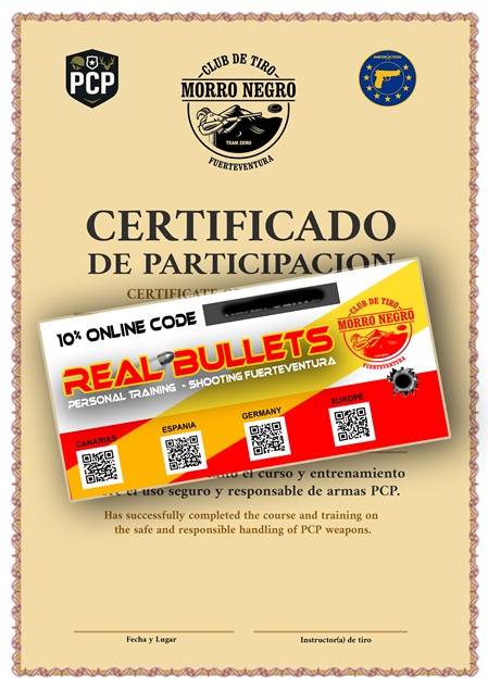 Después del entrenamiento de tiro con armas PCP, todos los participantes reciben un certificado personal y un cupón de descuento que puede canjearse con socios seleccionados (en Europa) para la compra de un arma propia.